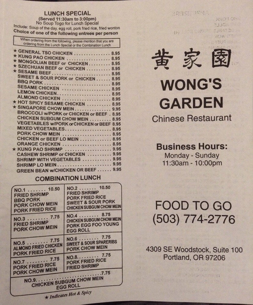Introducing Wong’s Garden, a Chinese restaurant in Portland, Oregon, known for its wide range of menu options and exceptional service. With offerings like BBQ Pork Fried Rice, Beef Noodle with Gravy, and Combination Dinners like Kung Pao Chicken, Wong’s Garden caters to a variety of tastes. Customers rave about the generous portions and flavorful dishes, with reviews mentioning favorites like lo mein, chow mein, and hot & sour soup. The restaurant offers takeout, delivery, and catering services, making it a convenient choice for any occasion. Whether dining in or ordering takeout, Wong’s Garden promises a satisfying meal with fresh ingredients and attentive staff. Experience the blend of traditional Chinese flavors and modern dining amenities at this beloved establishment on Woodstock Blvd.